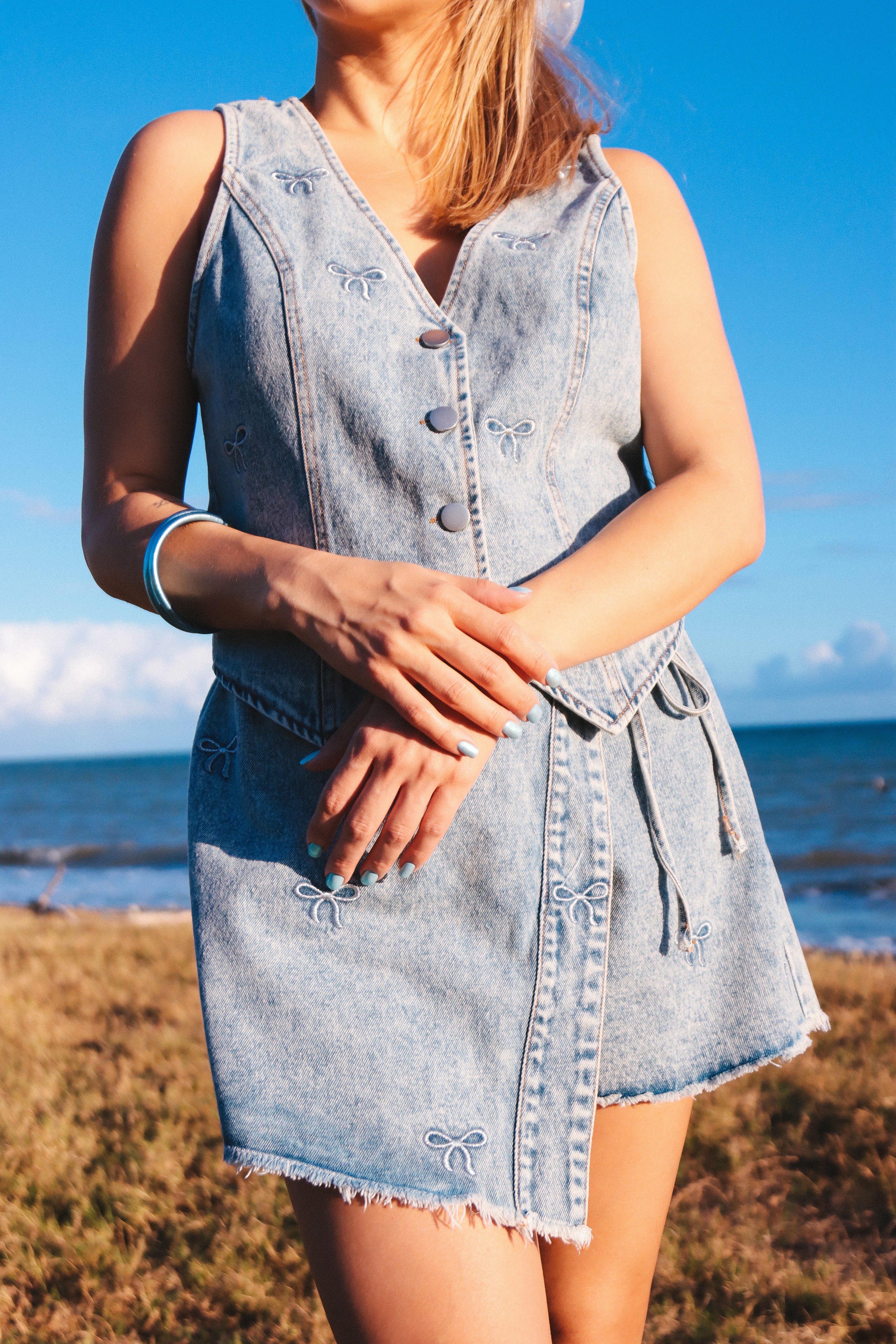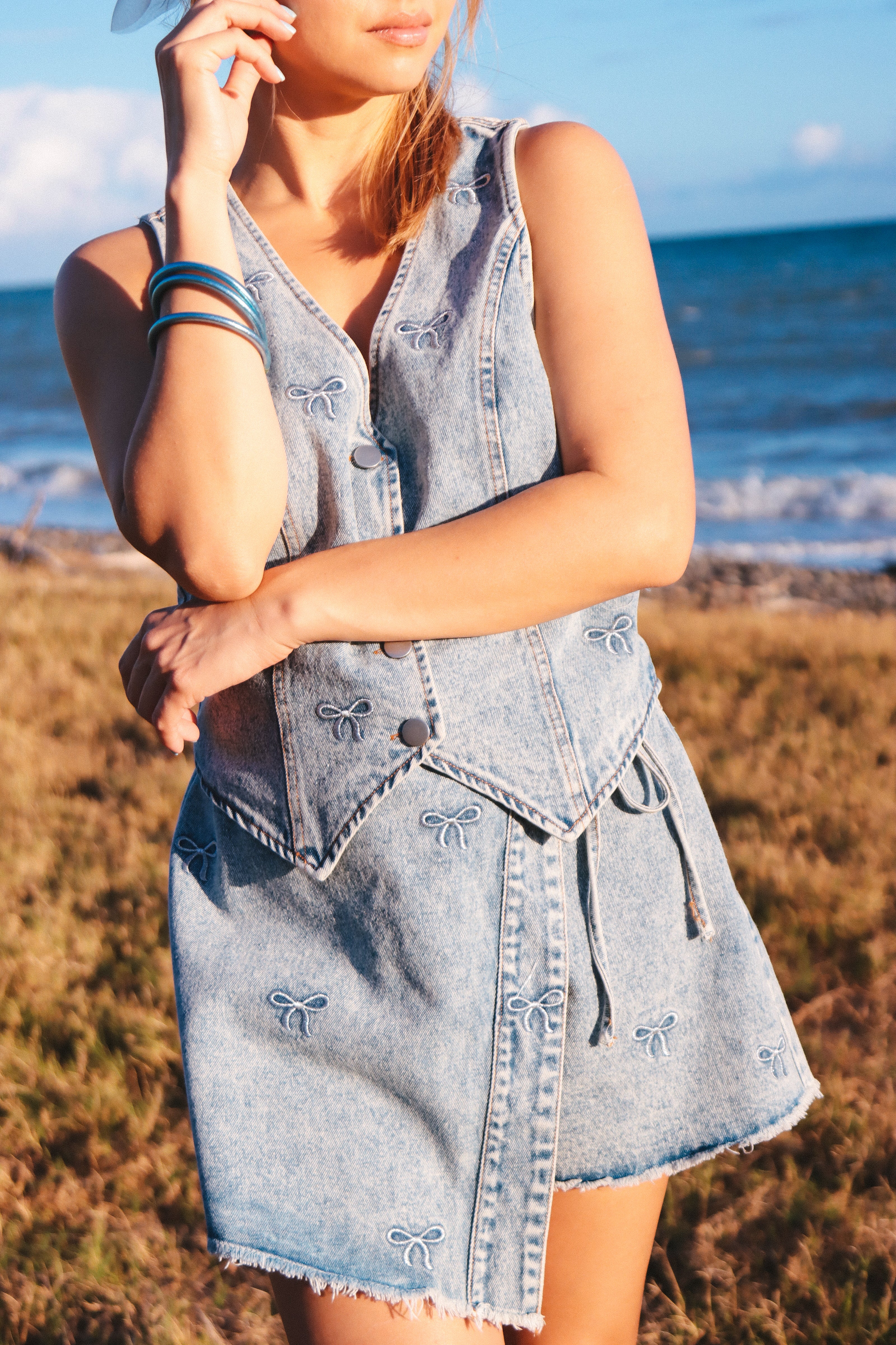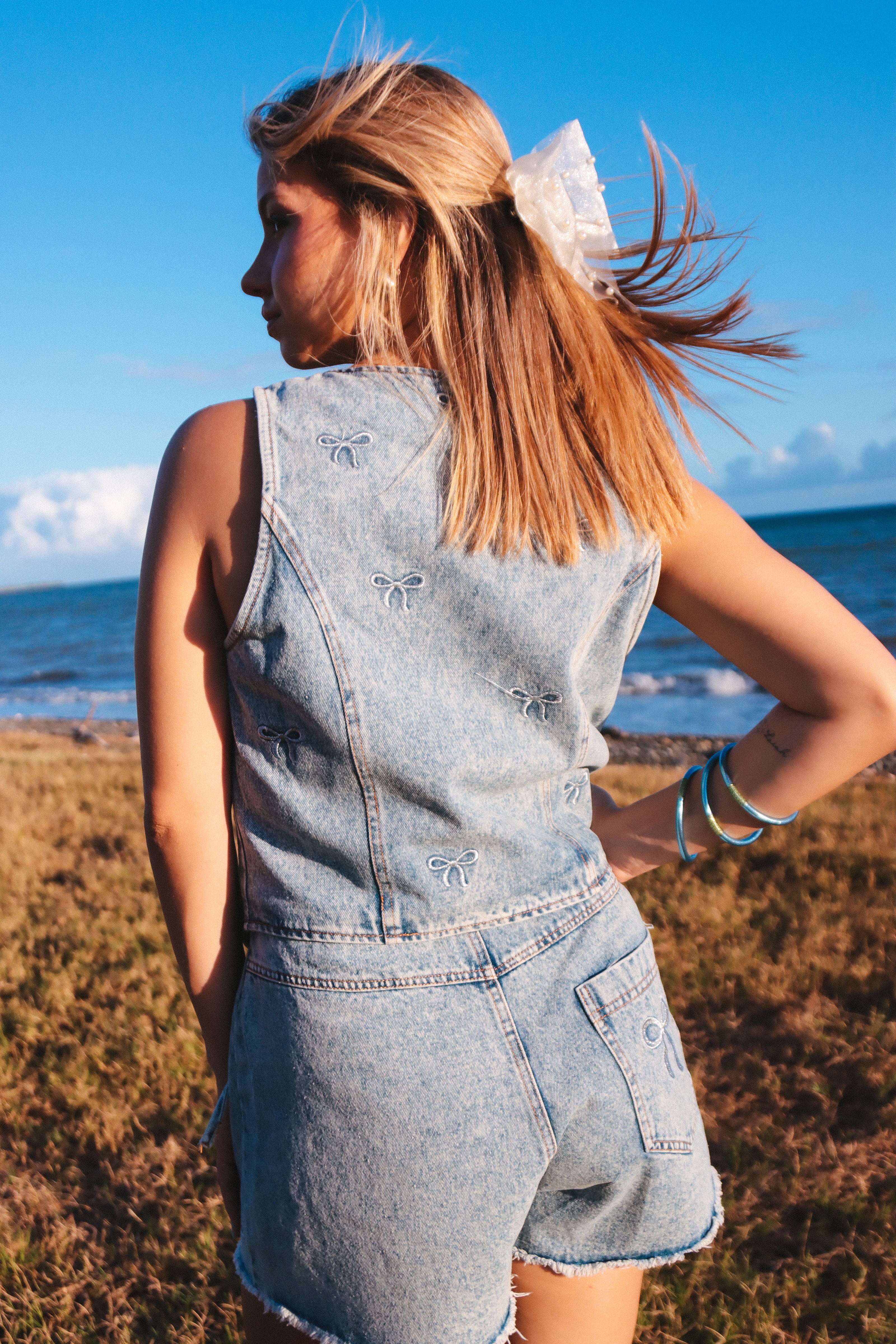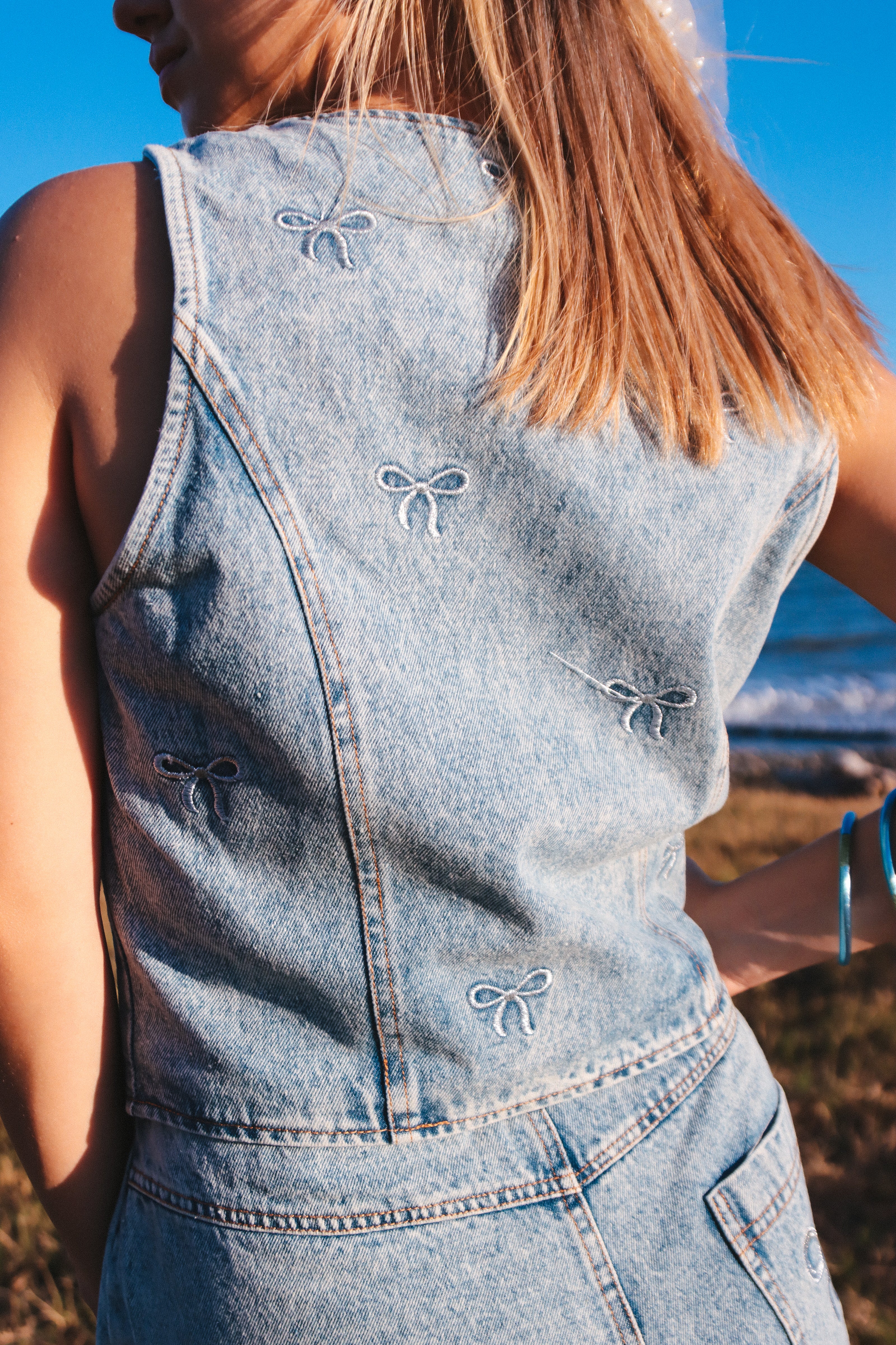 Add a playful twist to your everyday denim with the Bow Embroidery Denim Vest—a charming blend of edgy and sweet. Featuring delicate bow embroidery on a classic denim silhouette, this vest brings a touch of feminine flair to a wardrobe staple.