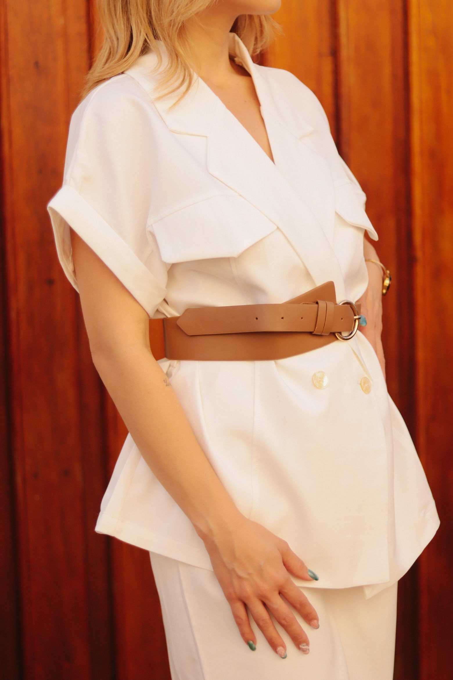 Short sleeve top with collar neckline, deep v-neck cut and button down closure. Includes belt on the waist. Straight leg bottom. Fitted set.s.