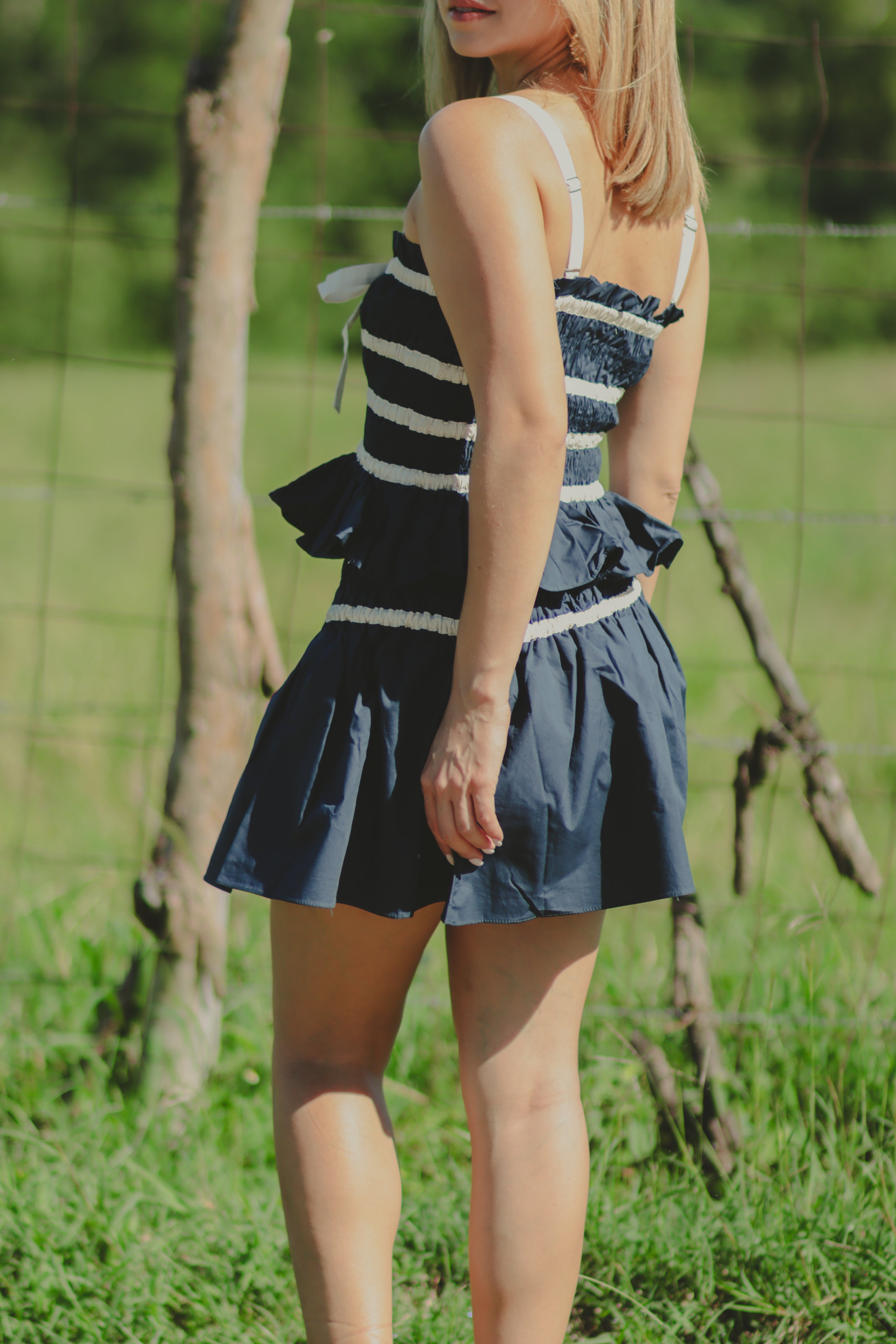 -Fabric: Non-stretch cotton poplin -Contrast adjustable straps -Contrast elasticated bodice -Front tie detail