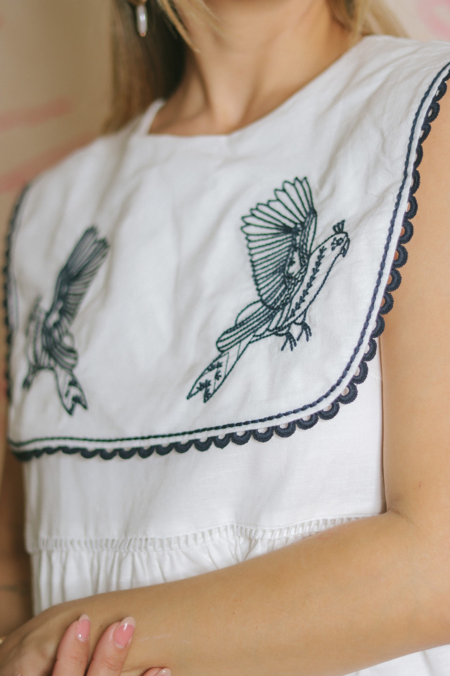 Featuring a beautifully detailed sailor-style collar with delicate embroidery, this dress brings a touch of vintage sophistication to your wardrobe. The flattering A-line silhouette and soft, breathable fabric ensure comfort while maintaining a polished look. Perfect for brunch dates, seaside strolls, or effortless day-to-night styling.