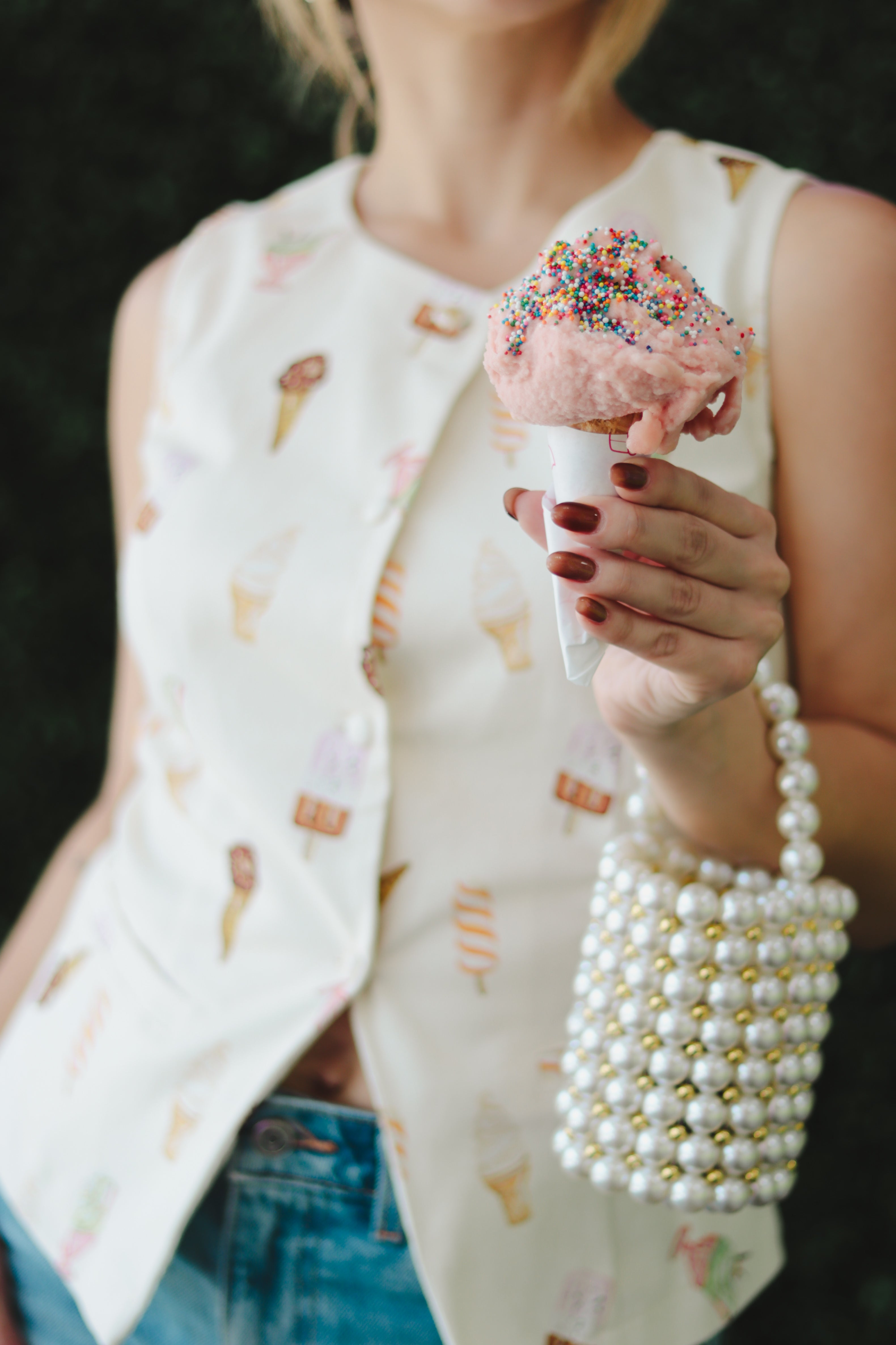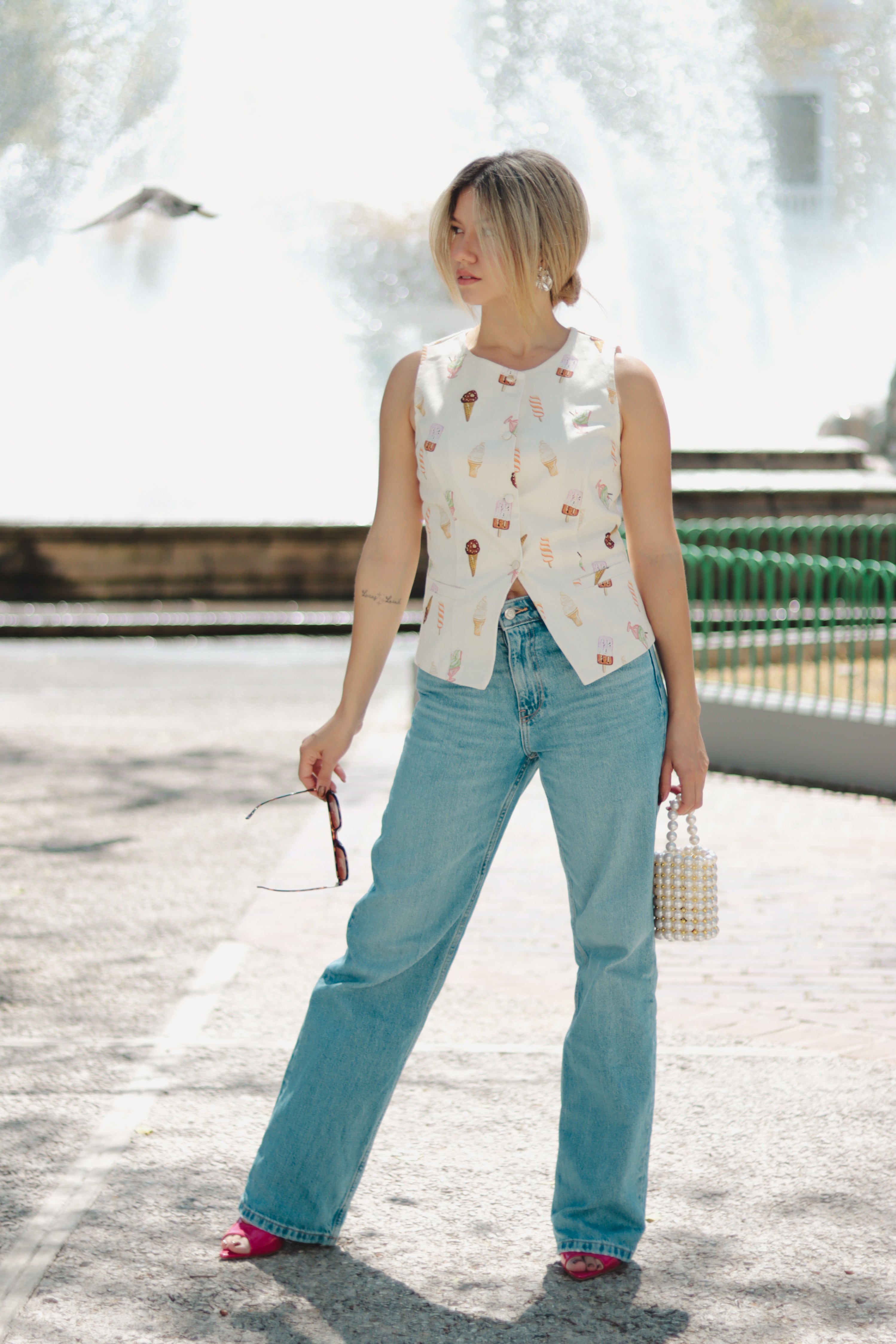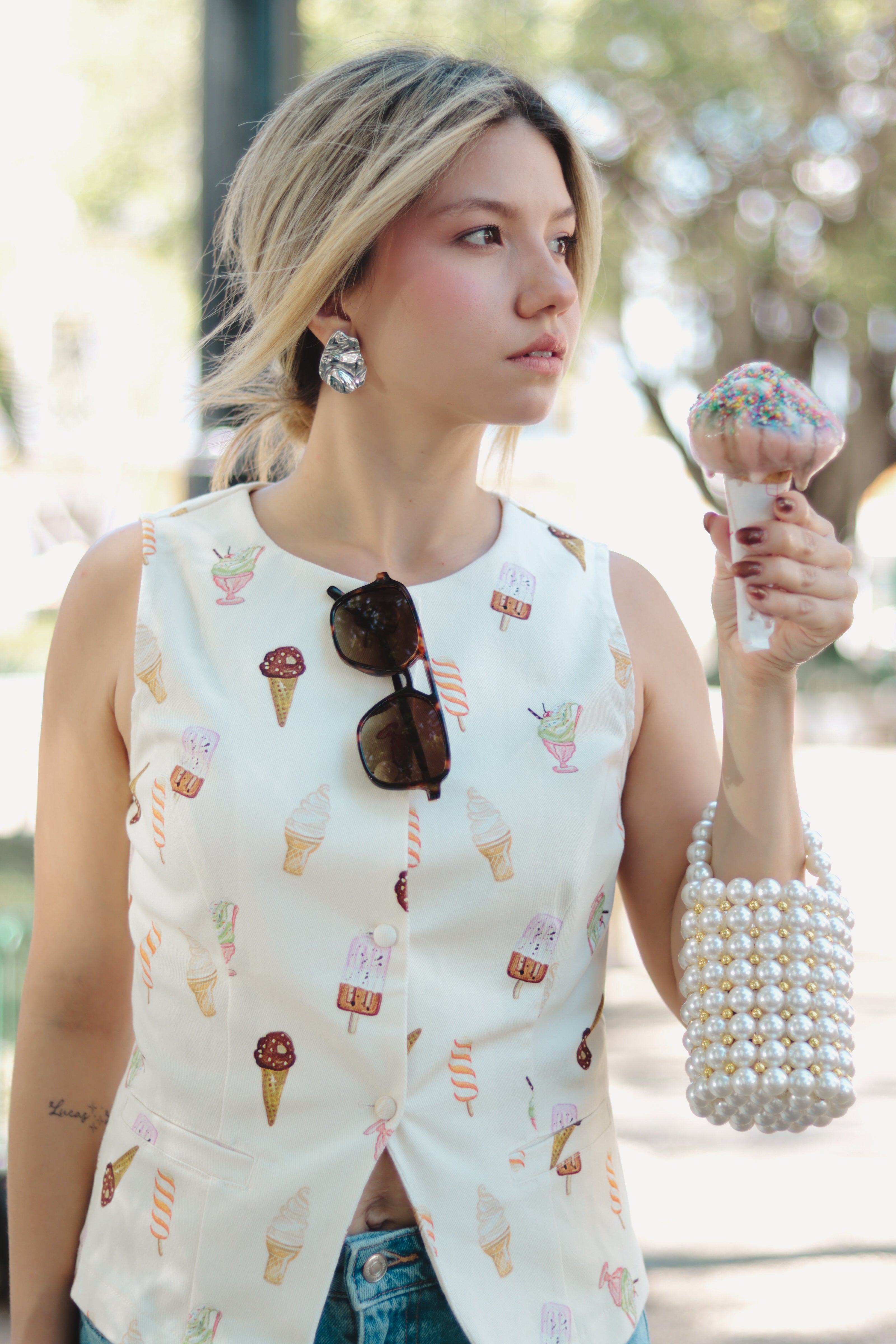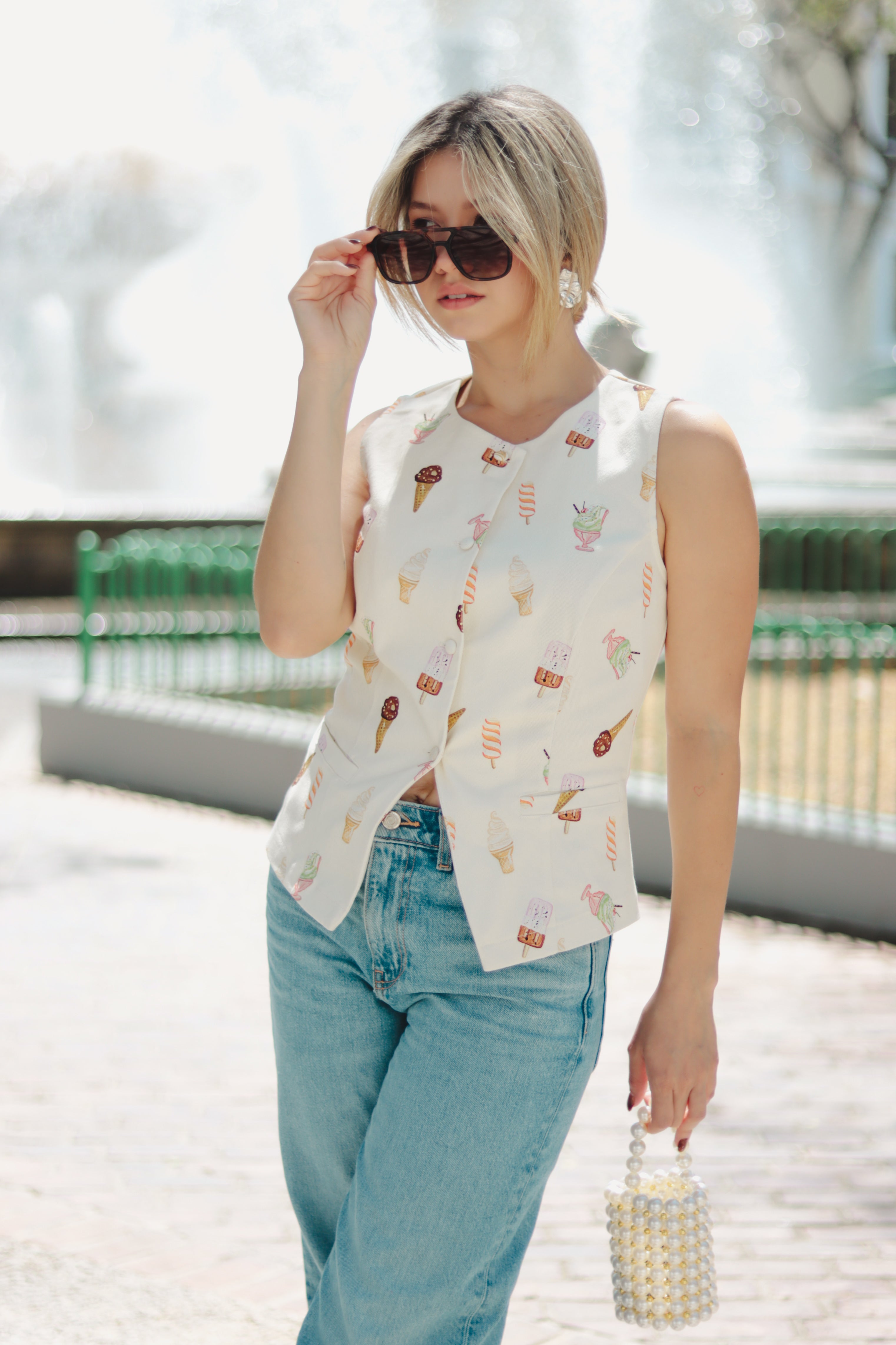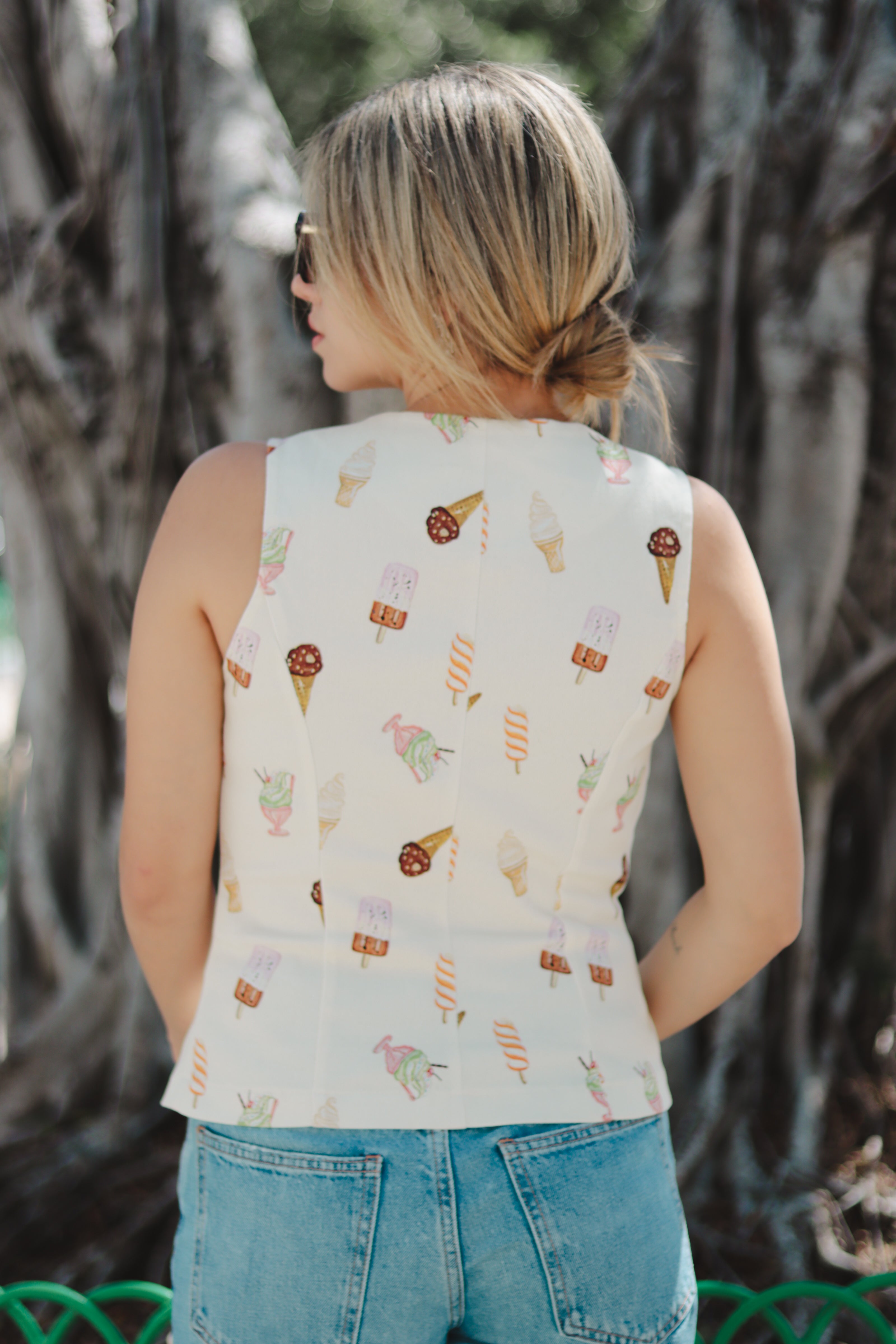 Featuring a playful all-over ice cream print in denim, this breezy sleeveless top is perfect for warm days and sweet summer vibes. The classic button-up design offers a polished touch, while the lightweight fabric keeps you cool and comfortable. Whether you're heading to a picnic, brunch, or a casual day out, this top is the perfect mix of charm and style.