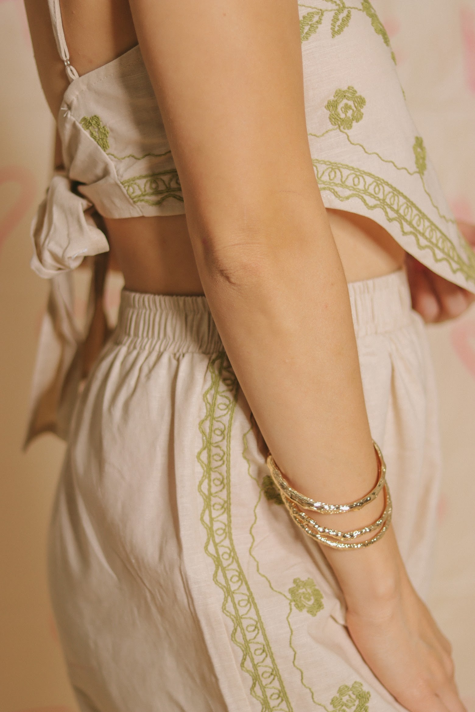 Crafted from a lightweight linen blend, this set features a beautifully embroidered scarf-style top that drapes gracefully, paired with relaxed-fit pants for a chic yet comfortable look. The intricate embroidery adds a touch of artisanal charm, making it perfect for vacations, brunch dates, or stylish everyday wear.