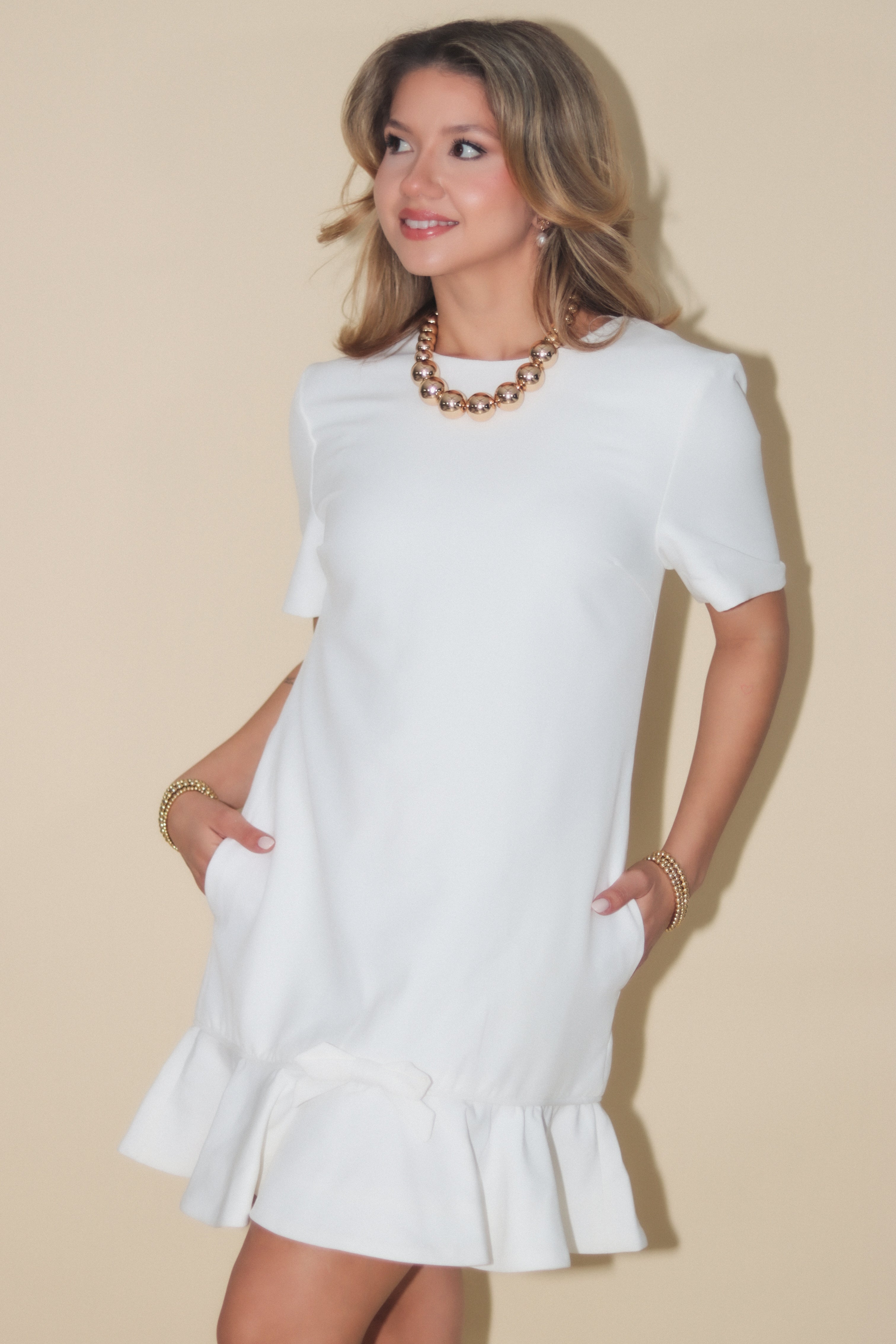 Short sleeve solid front bow detail ruffle hem mini dress. Back invisible zipper. Lining.